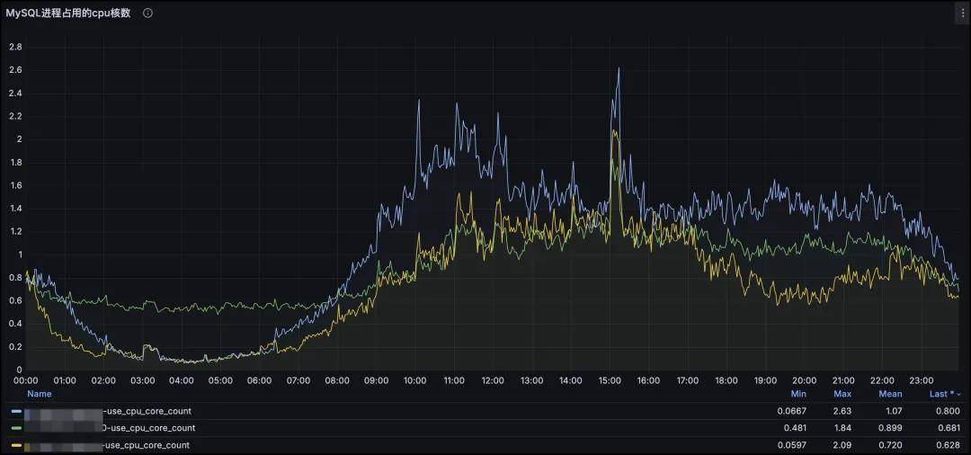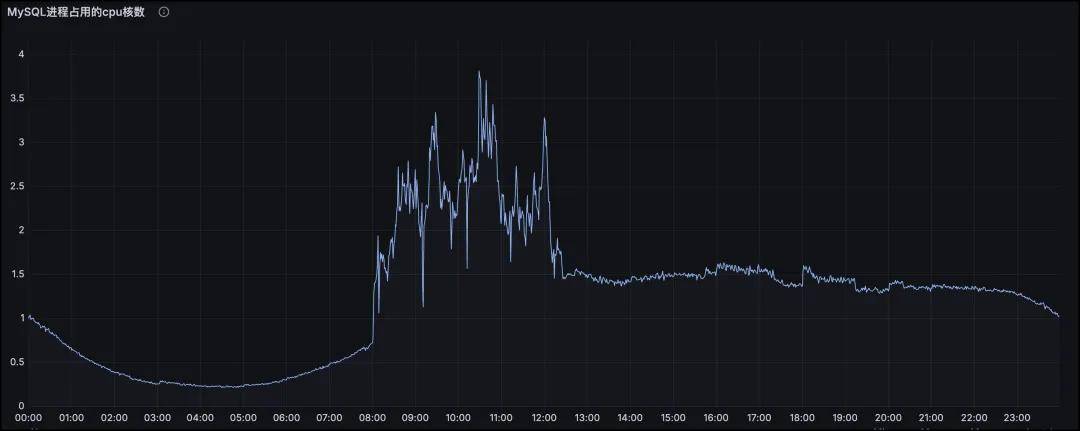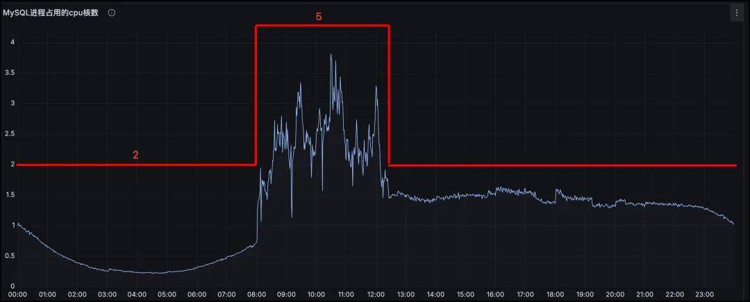 一般情况下业务的请求会有波峰和波谷,以及定时任务、促销和不定时的操作等造成的干扰,通常情况下告警的阈值是一个固定值,这其实是不合理的。以MySQL进程占用的cpu核数为例: