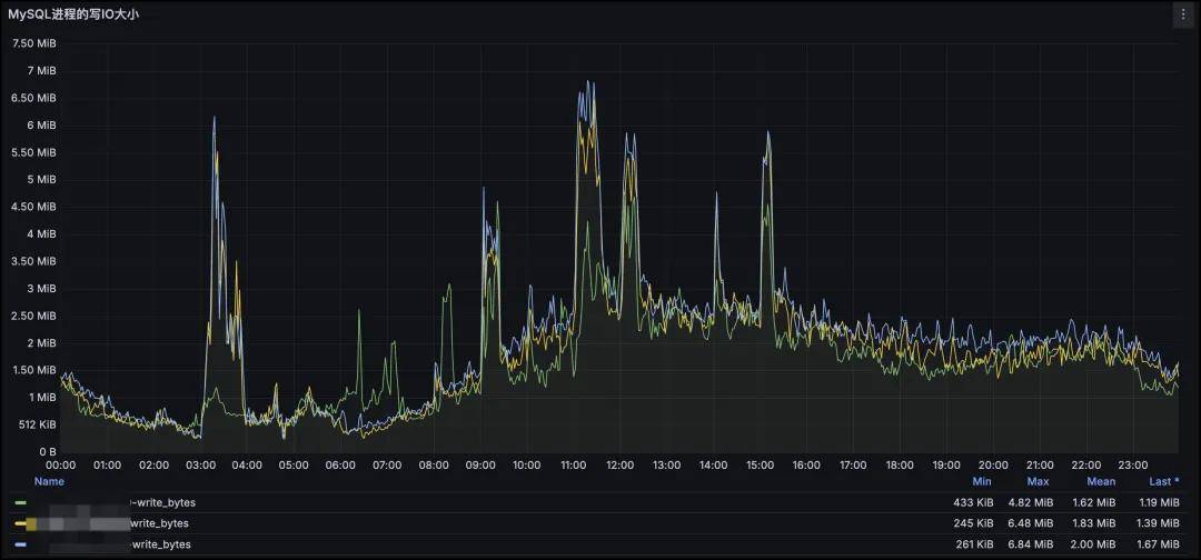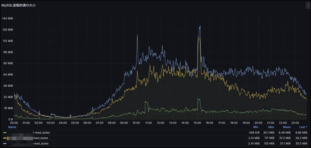 这是MySQL集群和进程维度的监控。通过对集群维度和进程维度的监控,可以看到对服务器压力最大的是哪个MySQL进程(亦或者是其他进程),并根据请求类型判定出是读还是写导致的,也可以根据请求量和进程占用的资源,可以大致评估出当前服务器可以承载的请求量上限。