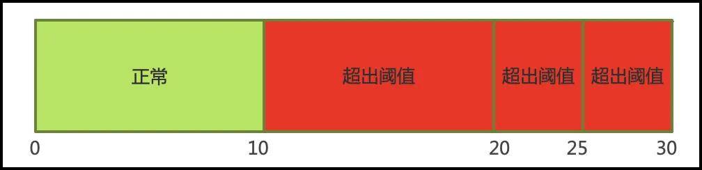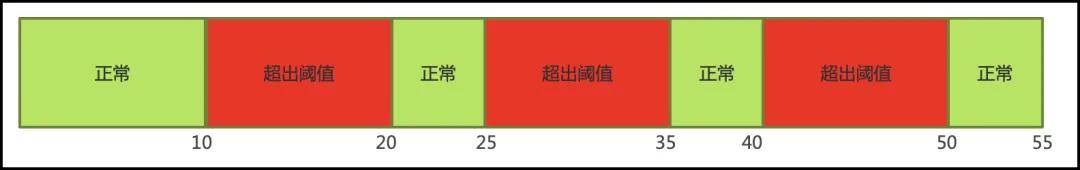 检测区间10-20超出阈值,20-25正常,25-35超出阈值,那么最近的三次检测中有两次超出阈值,且最近一次超出阈值,那么在第35s时刻就应该告警。