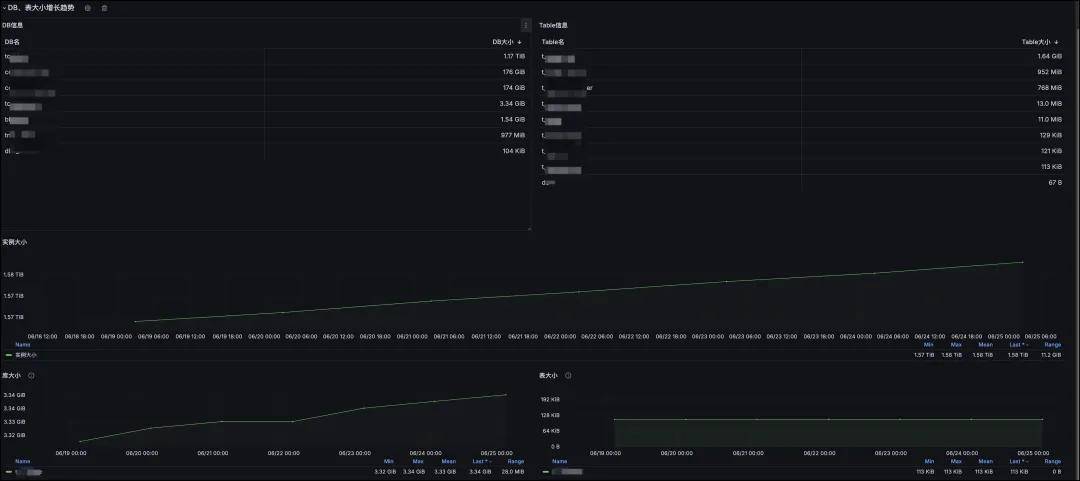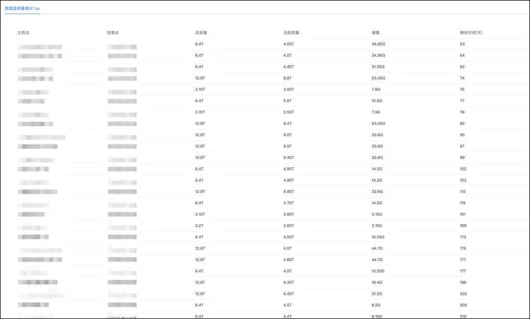 这是MySQL实例、库、表维度的数据采集。从【服务器数据盘容量评估报告】图中可以看出当前服务器的数据盘容量可以支撑多长时间。从【MySQL实例、库、表的数据采集】图中可以看出最需要注意的是哪个库表,增量主要来源于哪些库表,由此为依据,尽早对资源做规划。
