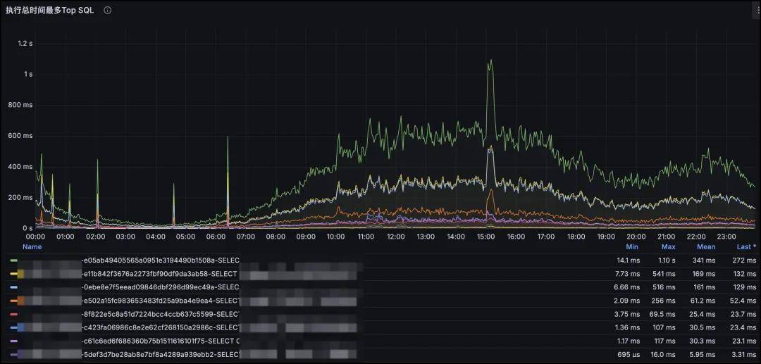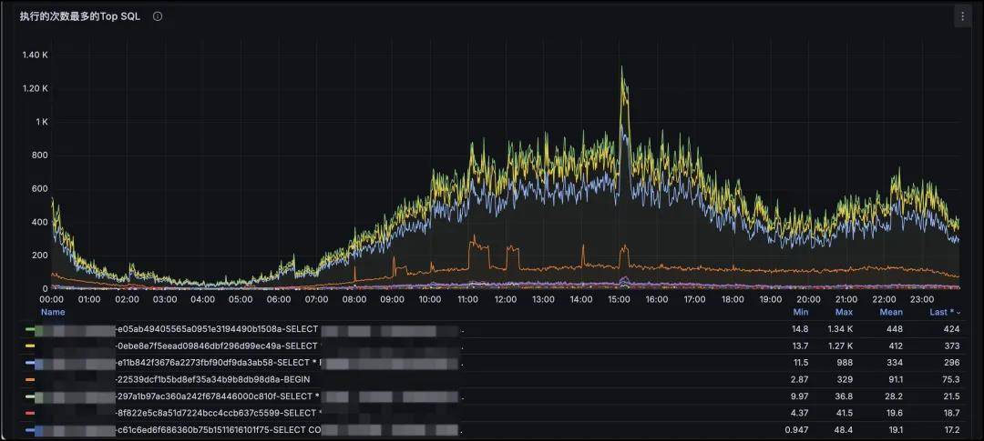 这是MySQL SQL维度的监控。深入到SQL维度的监控可以清楚的看到在某个时间点对数据库造成压力最大SQL是哪个,是因为SQL的请求量上涨导致的还是SQL的索引错误导致的,可以更迅速的定位具体的原因,为SQL优化提供依据。
