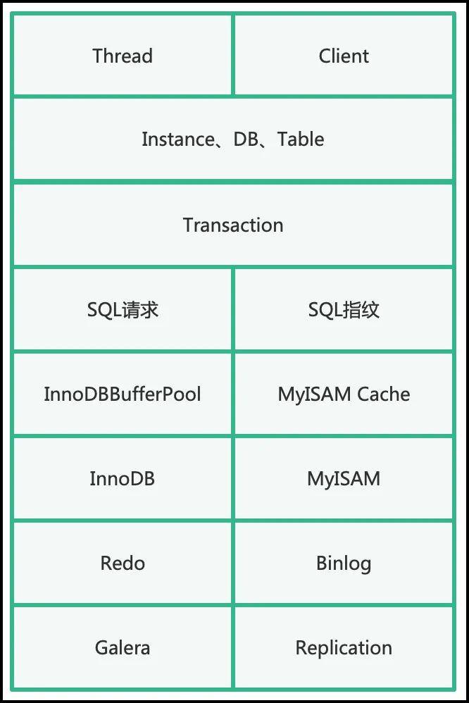 针对MySQL数据库需要采集的内部指标,包括:Thread和Client,Instance、DB和Table的状态,事务,SQL请求和SQL指纹、InnoDBBufferPool和MyIsAM Cache、InnoDB引擎和MyISAM引擎,Redo和Binlog,Galera(PXC架构)和Replication(复制)等指标。