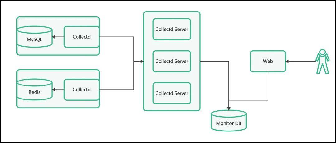 每个数据库服务器上部署一套collectd服务,collectd服务通过定时采集数据库的状态信息,将信息发送给collectd server。collectd server再将数据分类存储到监控数据库中,通过web页面查询数据库监控指标详情。