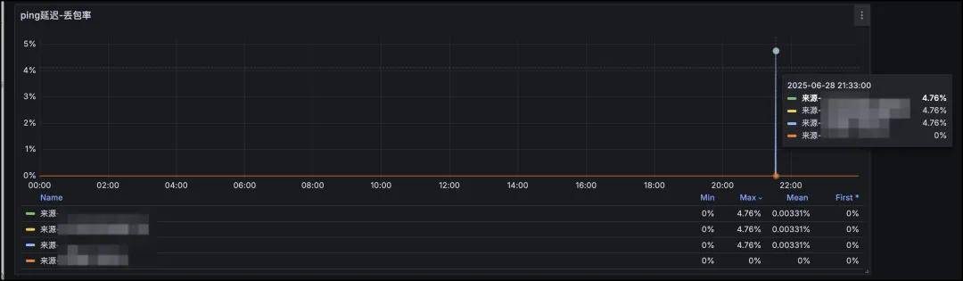 这是主机和网络方面的监控。从主机方面的监控可以看出在21:33时刻cpu和网卡波动不是很明显,但是某个业务的Redis QPS和连接数波动很大。通过对当前服务器从不同的IDC采集的丢包率监控,可以看出四条线路里面有三条发生了丢包,由此可以得出21:33是网络抖动导致的业务请求出现抖动。