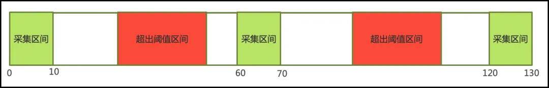 如上图,0-10、60-70、120-130均为采集区间,采集区间内并没有超出阈值,但是在其他区间内超出阈值。采集区间与告警区间可能刚好存在非重叠的状态,这就导致当前指标本来应该告警,但是没有告警,造成漏报。