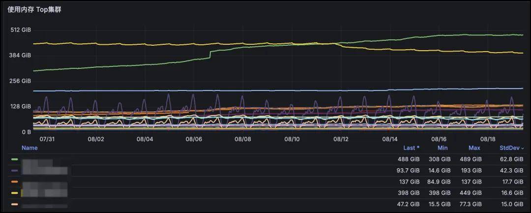 通过个性化标签可以定制高纬度的汇总信息,这是部门维度的Redis监控。通过定制化展示部门下的Redis/MySQL/服务器等各个维度资源的使用量和增长趋势,可以根据使用情况和变化趋势提前规划资源的使用。由图中可以看出当前部门下的Redis请求量和cpu使用率均保持稳定,增幅不明显但是内存使用量在逐步增长。从部门下Redis【使用的内存Top集群】图中可以诊断出是哪个集群的容量在逐步增长导致的,并据此采取治理措施。