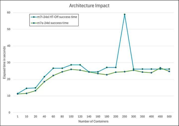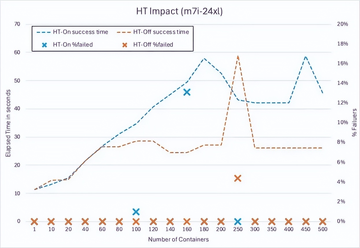 超线程 (HT):如图 6 所示,在 m7i.metal-24xl (Intel) 上禁用超线程后,容器启动延迟降低了 20% 至 30%。因为超线程会争用共享的执行资源,加剧锁争用。启用超线程后,每个物理 CPU 核心会被分成两个逻辑 CPU(超线程),它们共享核心的大部分执行资源,例如缓存、执行单元和内存带宽。虽然这能提高未充分利用核心的工作负载的吞吐量,但对高度依赖全局锁的工作负载带来了巨大的挑战。禁用超线程后,每个线程都在其自身的物理核心上运行,从而消除超线程之间对共享资源的争用。因此,线程可以更快地获取和释放全局锁,从而减少整体争用,并改善通常共享底层资源的操作延迟。