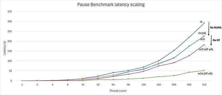 在 r5.metal 上,仅使用单个插槽来消除 NUMA 可以显著降低高线程数下的延迟。