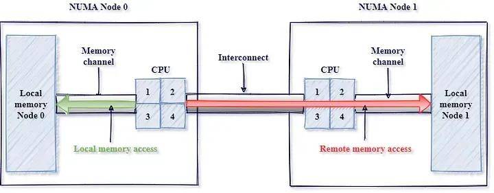 非统一内存访问 (NUMA) 是一种系统设计,其中每个处理器都拥有自己的本地内存以实现更快的访问速度,但需要通过互连网络才能访问连接到远程处理器的内存。NUMA 于 20 世纪 90 年代引入,旨在提高多处理器系统的可扩展性。NUMA 提升了性能,但也导致 CPU 访问连接到另一个处理器的内存时延迟增加。图 4 是一张简图,描述了 NUMA 架构的本地访问与远程访问模式。