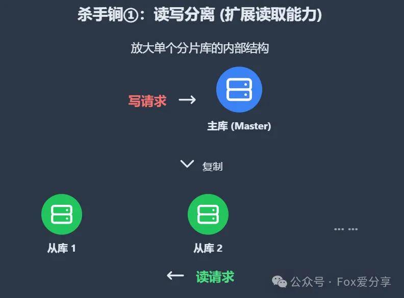 在每一个分片库的内部,再构建一主多从(Master-Slave)的集群。写请求只打到主库,而海量的读请求则由多个从库来分担。从库不够?加!这是水平扩展读取能力最直接的手段。