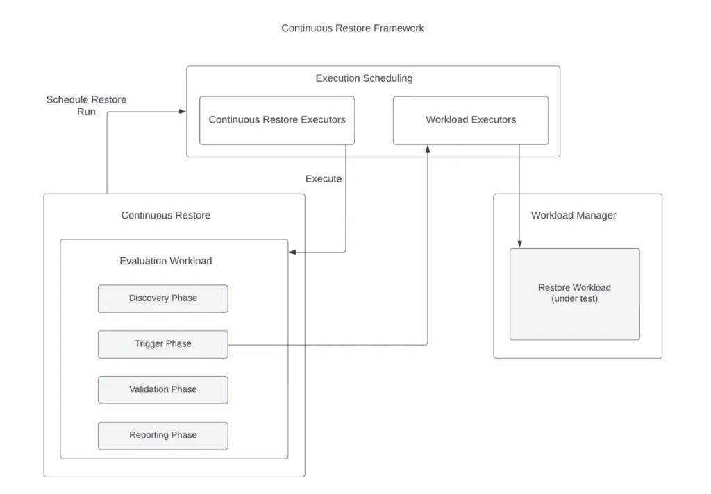 触发阶段:通过创建临时集群进行测试来执行恢复过程。它会设置一个新集群并触发恢复,利用可扩展恢复框架。此阶段充当被测系统,负责从备份中执行实际的恢复操作。