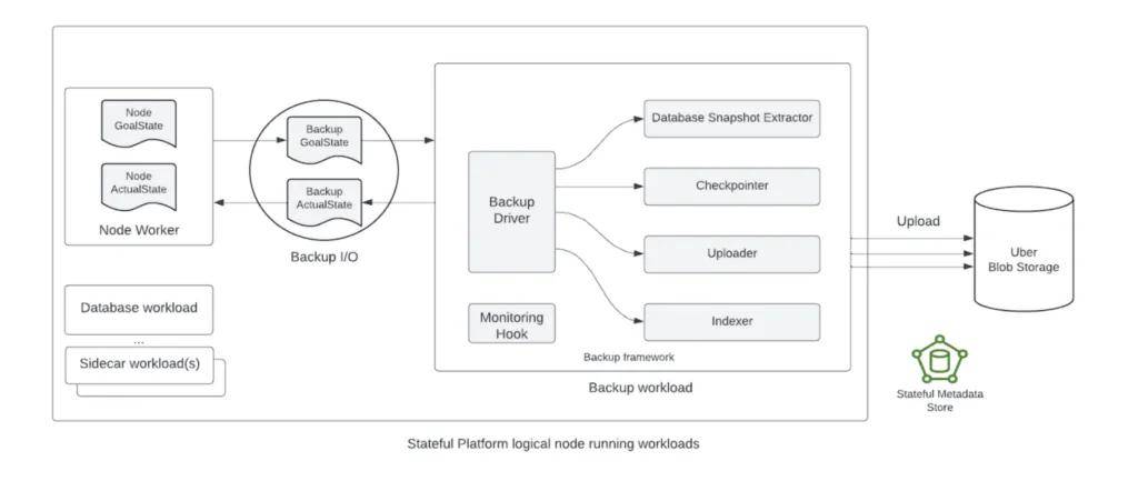 Backup框架是一个通用备份驱动程序,集成了特定技术的插件,用于执行数据库快照逻辑,并高效可靠地上传到 Uber 的 Blob 存储。运行时备份工作负载作为按需 sidecar 容器运行,与主流容器(例如技术节点工作容器和数据库容器)并行运行。节点是运行在由主机集群支持的容器化 cgroup 中的有状态工作负载单元,遵循目标状态驱动架构。