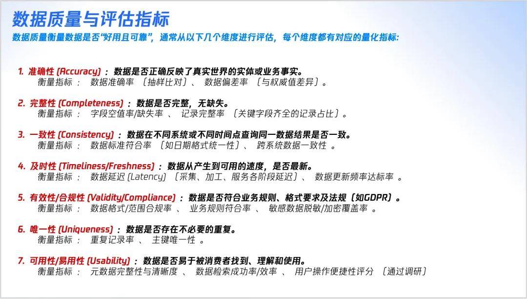 数据质量绝非运行几个 SQL 检查脚本那么简单,其深度在于 工程化、自动化、可观测的系统性建设 。数据质量衡量数据是否“好用且可靠”,通常从以下几个维度进行评估,每个维度都有对应的量化指标: