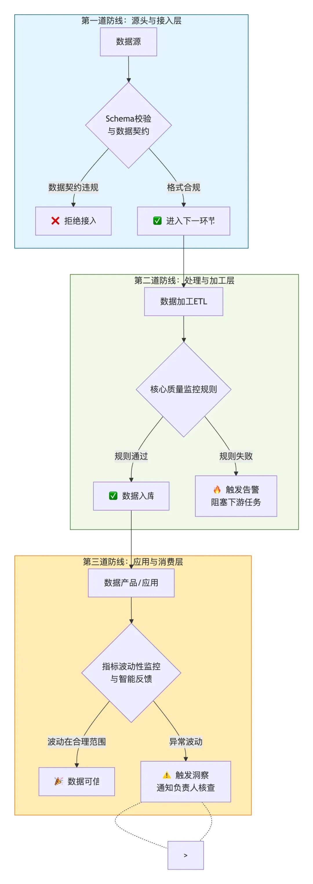 推动建立数据质量监控的“三道防线”: 源头与接入层、处理与加工层、应用与消费层;