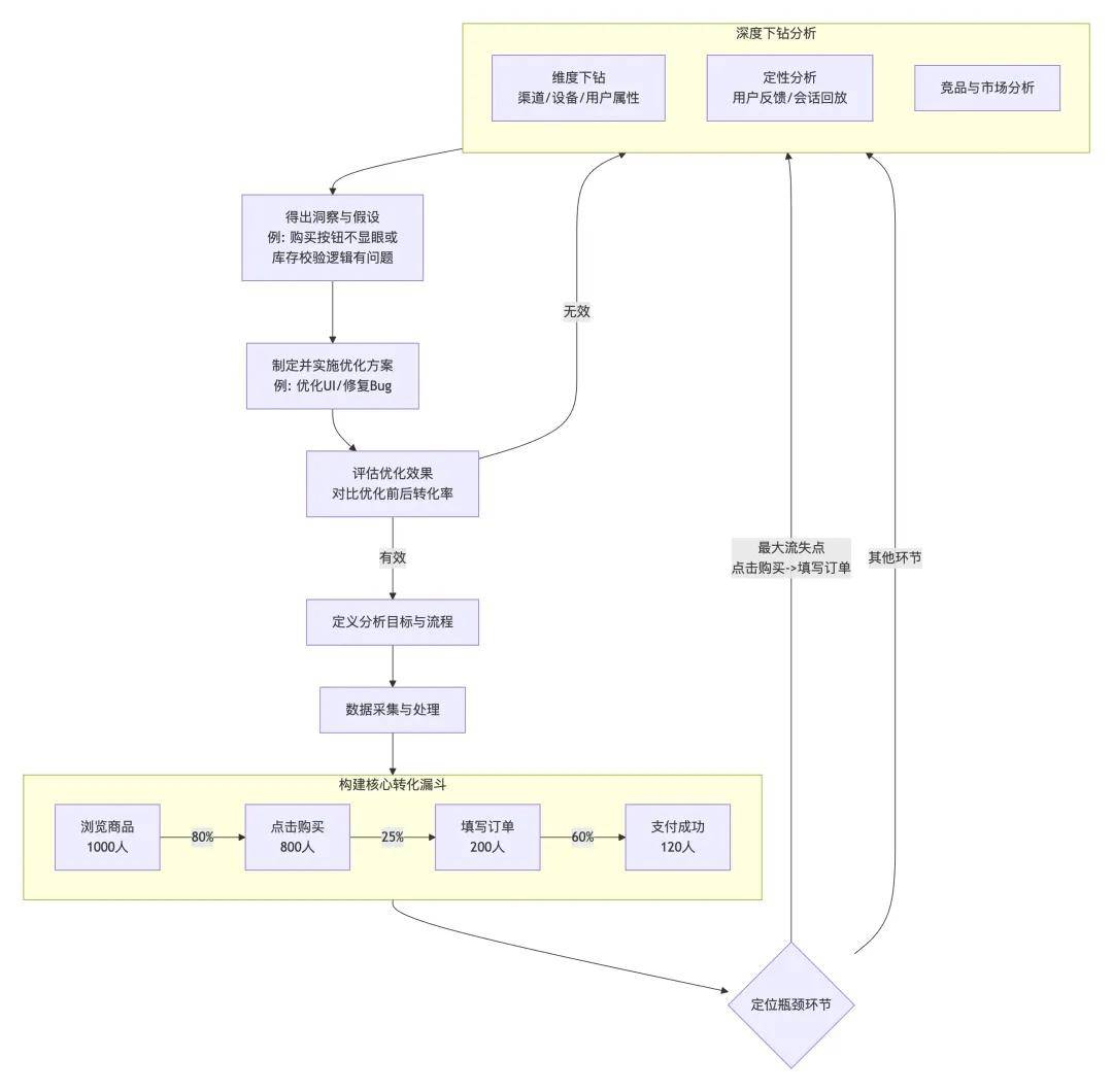 复盘与优化(事后:修路)发现数据不好看(比如转化率低、用户流失严重)的时候。对照着地图,一步步检查用户实际走到了哪一步就走丢了、为什么放弃。是页面加载太慢?还是操作太复杂?马上就能定位到具体环节去修复。