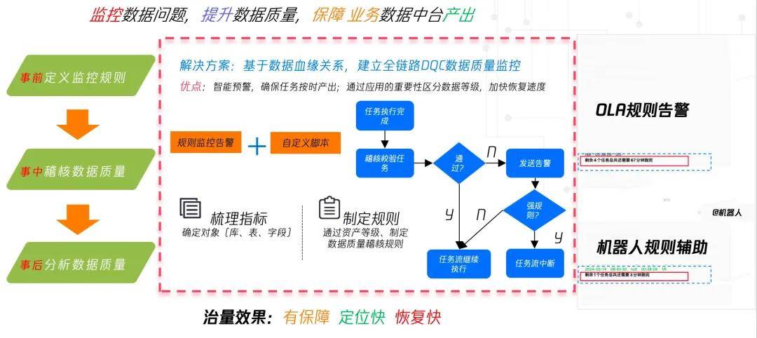 解决办法:事前定义监控规则、事中稽核数据质量、事后分析数据质量。
